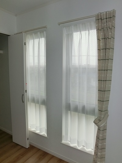 枠外にカーテン(装飾レール 機能レールどちらでも可能)枠内にもカーテンを納める方法です。 出窓など奥行きのある場合は出窓の有効巾が生きてくるのでこの納め方が良いです。 また、画像の様にクローゼットと接する窓や廊下廻りの窓にもおすすめです。